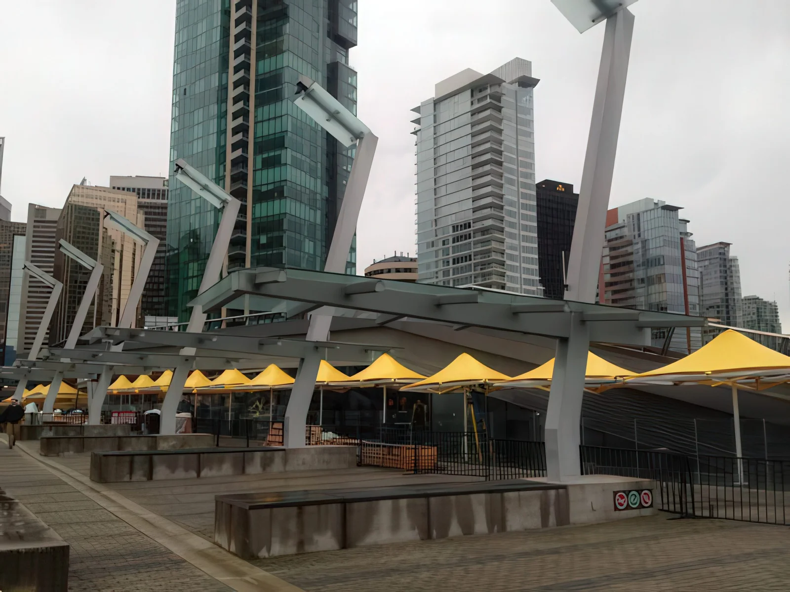The architect required two tone fabric on the umbrella membranes and Celmec provided custom made umbrellas with the topside black to tie in with the glazing colour of the buildings surrounding the square and the underside silver to aid the open feel within the structures.
