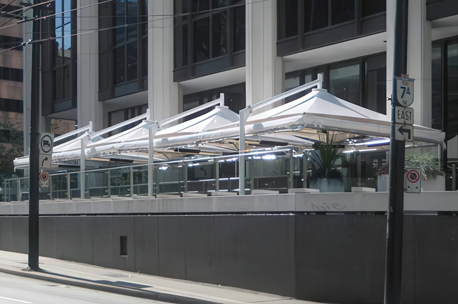 Arintji Restaurant located in Melbourne's Federation Square, faces exceptionally chilly breezes in winter and extreme heat during summer due to the mass of stonework within the square.